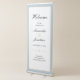 This modern minimal retractable wedding banner offers a white background with a dusty blue and gold border. The design features an elegant script for the names. The blue color can be changed to any other color by choosing customize.