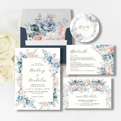 Dusty Blue and Peach Elegant Floral Wedding Invitation