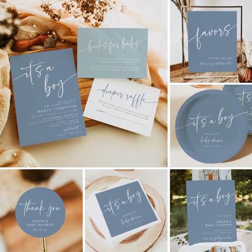 Stylish baby shower paper plates that feature a dusty blue color palette and a modern font. The minimalist design is perfect for a modern or boho themed baby shower for a little boy. Pair with anything in the OLIVER collection for a cohesive look.
