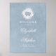 Dusty blue elegant wedding welcome sign poster with baby's breath floral wreath monogram