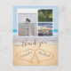 Beach Wedding Thank You Postcard. Featuring a 3 Photo collage, Two hearts in the sand, teal blue background
