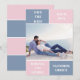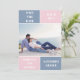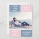Dusty blue and blush pink color block wedding Save the Date card. The back includes a pattern with wide bands in dusty blue and blush pink.