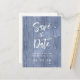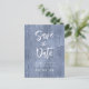 This unique modern save the date postcard features a background design of dusty blue impasto brush strokes. The words "Save the Date" appear in bold white handwriting script. Easily customize the white sans serif text with your names and wedding date. On the reverse side, edit the customizable return address and enter your wedding website URL to generate a QR code your guests can scan to learn more about your upcoming event.