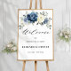 Dusty blue floral rehearsal dinner welcome poster featuring elegant bouquet of navy blue, royal blue , white , gold, champagne ivory, blush color rose , ranunculus flower buds and sage green eucalyptus leaves and elegant watercolor bouquet. Please contact me for any help in customization or if you need any other product with this design.