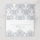 An elegant dusty blue calligraphy damask design template with space for name and table number. A simple formal design with a modern look and color.