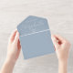 This all-in-one minimalist wedding invitation features elegant typography on a dusty blue background. The invitation includes a perforated RSVP card with your wedding website QR code. Designed by Thisisnotme©