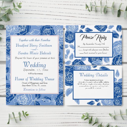 Blue Floral Stylish Rose Chic Simple WeddingDesigned by Sandy Closs