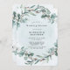 Design features a printed colored foliage element in shades of light green and dusty blue. Blue green watercolor canvas textures with calligraphy script or type writing. Great for your wedding celebrations!