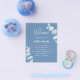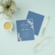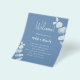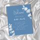 A modern, elegant, wedding program, timeline. Dusty blue background, decorated with eucalyptus, sprigs. Personalize and add your names and wedding details. If you have more text it's possible to reduce the line space and also add text on the back.