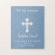 Celebrate the special milestone of a First Holy Communion with this gift. Against a backdrop of soft dusty blue, an intricate cross with delicate rays emanating outward symbolizes the divine grace of this significant day. Modern typography in pure white elegantly presents the words "First Holy Communion" alongside the customizable name, reflecting the purity and innocence of the occasion. This makes a perfect personalize gift for a special boy on her first Holy Communion!