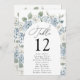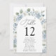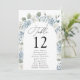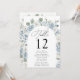 Elegant floral wedding seating chart featuring an arched floral frame of dusty blue and white roses, hydrangeas, and lush eucalyptus leaves and greenery. "Table" is displayed in a black calligraphy script with the table number and guest names shown below on a white background. The design repeats on the back. To order the table number seating chart, edit each card with the table number and guest names and add it to your cart. Designed to coordinate with our Elegant Dusty Floral wedding collection.