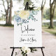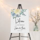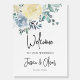 This watercolor wedding welcome sign features dusty blue and ivory florals with greenery.