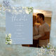 This elegant dusty blue greenery floral save-the-date invitation can be personalized with your information in chic typography and special photo on the reverse. Designed by Thisisnotme©