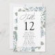 Elegant floral wedding seating chart featuring a rectangular floral frame of dusty blue and white roses, hydrangeas, and lush eucalyptus leaves and greenery. "Table" is displayed in a black calligraphy script with the table number and guest names shown below on a white background. The design repeats on the back. To order the table number seating chart, edit each card with the table number and guest names and add it to your cart. Designed to coordinate with our Elegant Dusty Floral wedding collection.