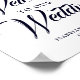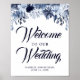 Beautiful arrangement of deep blue and soft blue flowers tops this wedding welcome sign. Wedding Welcome is written in a dramatic indigo blue color. The wedding couple names and date are at the bottom.