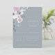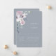 Beautiful watercolor garden floral arrangement of anemones, roses, eucalyptus and greenery in trendy shades of violet, pink and green. Background color shown in dusty blue, can be customized.