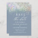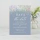 Dusty Blue Glitter Wedding Save The Date Cards features a dusty blue background accented with iridescent glitter and your custom save the date information. Personalize with your text by editing the text in the text boxes provided. Designed for you by ©Evco Studio www.zazzle.com/store/evcostudio