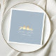 Elegant dusty blue wedding napkins with a romantic gold foil look illustration of two lovebirds perched on delicate branches. Personalized with the couple’s names and wedding date in modern calligraphy. A soft, charming accent for spring, summer, or fall wedding receptions with a blue, gold, or romantic nature-inspired theme. Matches the full Dusty Blue & Gold Lovebirds invitation suite.