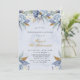 Design features a printed colored with floral element in shades of dusty blue and gold over greenery leaves and peony and rose blooms. Great for your wedding celebrations!