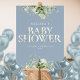 An elegant baby shower sign featuring modern typography and pretty botanical greenery foliage on a dusty blue background. Designed by Thisisnotme©