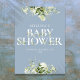 An elegant baby shower sign featuring modern typography and pretty botanical greenery foliage on a dusty blue background. Designed by Thisisnotme©