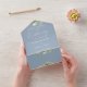 All in one wedding invitation featuring parents' names, botanical greenery rustic leaves, and elegant typography on a dusty blue background. The invitation includes a perforated RSVP card featuring a QR code. Designed by Thisisnotme©