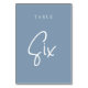 Simple and chic table number cards in Dusty Blue and white make an elegant statement at your wedding or event. Design features "table [number]" in an eyecatching mix of classic serif and handwritten script lettering. Design repeats on both sides. Individually numbered cards sold separately; order each table number individually from our collection.