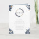 This folded invitation is perfect for any couple looking to add a handwritten message to their invite! This design features gorgeous, dusty-blue bouquets of delicate leaves and flowers in the corners of the design, with a monogram of your initials at the top, framed in a gold glitter and floral wreath. Under your monogram is your invitation typography in a classy, yet modern blend of fonts.