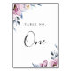 Modern and elegant typography design, table number card. Card features elegant watercolor floral and foliage corner frames in shades of mauve, white and dusty blue. When ordering table number cards, each card must be numbered and ordered individually.