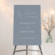 Minimal wedding welcome sign featuring modern script that says "welcome to our wedding" on a dusty blue background. Simple and elegant design.
