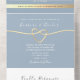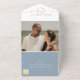 Simple, minimalist, elegant, modern calligraphy script, dusty blue all-in-one wedding invitation with faux gold rope heart and custom picture of the couple at the back.