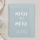 Custom-designed wedding planner notebook featuring "Miss to Mrs." modern hand script design on dusty blue background.