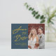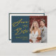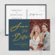 Dusty Blue Elegant Gold Script Modern Photo Minimalist Wedding Save The Date Announcement Postcard. Let your family, friends and colleagues know that you have set a date for your wedding celebration with this elegant, stylish and modern wedding save the date invitation card. All the texts are pre-arranged for you to personalize easily and quickly with your own details.