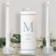 Simple, minimalist, and chic Wedding Unity Candle Set features a modern design with a double framed border in dusty blue on a crisp white background. Personalize wedding details with your names, initials and wedding date in elegant dusty blue lettering and script on the center candle. Each taper has bride and groom's single initial in a matching script. Makes a beautiful addition to the ceremony and wedding keepsake for the newlyweds!
