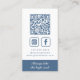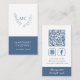 Dusty Blue Monogram Wreath with Slogan Vertical Business Card... The front of our unique dusty blue business card features an elegant botanical wreath bordering your two monogram initials in blue ink on a white background. Your name and title (or company name) appear in white ink on a dusty blue rectangle bordering the bottom of the business card, giving an authoritative structure to balance the delicate leafy wreath. On back of the card are your phone number, social media contact info, website address and QR code linking to additional information. The dusty blue section on bottom contains your business motto or tagline. Example text currently shows "Always take the high road" in white script typography. All text and the QR code can be easily revised on the personalization template.