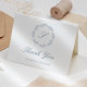 This elegant wedding thank you card features a dusty blue foliage wreath surrounding a script monogram initial. The words "Thank You" appear in dusty blue script. Add the names of the bride and groom below in dusty blue.
