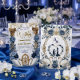 Set the tone for a timeless union with this regal design featuring classical architecture, romantic swans, and lush botanical details for your formal event.