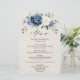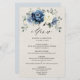 Dusty blue floral wedding menu featuring elegant bouquet of navy blue, royal blue , white , gold, champagne ivory, blush color rose , ranunculus flower buds and sage green eucalyptus leaves and elegant watercolor bouquet. Please contact me for any help in customization or if you need any other product with this design.