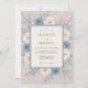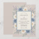 This romantic design showcases a soft palette of dusty blue and cream blooms atop a neutral taupe backdrop. Artistic watercolor roses and delicate sprigs of lavender evoke a serene meadow feeling. Muted sage green leaves provide a natural finish to the elegant floral arrangement.