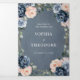 Dusty blue floral geometric wedding Invitation featuring elegant bouquets of navy / Dusty blue, white , blush , peach rose and sage green eucalyptus leaves and elegant glitter geometric neutral frame. Please contact me for any help in customization or if you need any other product with this design.