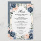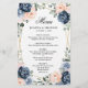 Dusty blue floral geometric wedding menu featuring elegant bouquets of navy / Dusty blue, white , blush , peach rose and sage green eucalyptus leaves and elegant glitter geometric neutral frame. Please contact me for any help in customization or if you need any other product with this design.