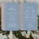 This elegant, modern wedding program fan features a dusty blue background edged with peach faux glitter. The text appears in elegant white handwriting and copperplate fonts.