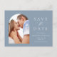 Announce your wedding in a truly elegant way with this Dusty Blue Photo Arch Save The Date Postcard. It features a stunning photo framed by a minimalist arch design. The soft dusty blue backdrop and graceful calligraphy create a modern, sophisticated wedding announcement that beautifully combines simplicity with a personal touch.