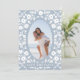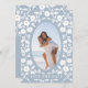 Announce your big day with charm and style using this custom romantic Save the Date photo card. The front features a delicate white folk-style floral frame that beautifully highlights your favorite photo in a soft oval shape on a dusty blue background. Beneath it, elegant Save the Date text joyfully shares your exciting news.