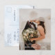 This elegant wedding thank you design pairs a romantic full-photo layout with soft dusty blue botanical details on the reverse side. Delicate French-inspired scrollwork and a graceful blue palette create a timeless look that feels refined, heartfelt, and polished after your celebration. The coordinating postcard format is perfect for sharing a personal note of appreciation with family and friends while keeping your stationery suite beautifully cohesive. A lovely choice for classic, formal, and romantic weddings with a soft blue aesthetic.