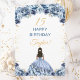 This elegant and glamorous birthday card can be personalized with a name or title such as daughter, granddaughter, niece, friend etc. The design features a beautiful princess with dark hair in a dusty blue ball gown. The text combines handwritten script and modern sans serif fonts for a classy and sophisticated look. The floral arrangements and gold confetti create the perfect blend of rustic and chic.