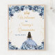 This elegant and glamorous Quinceañera welcome sign features a beautiful princess with dark hair in a dusty blue ball gown. The text combines handwritten script and modern sans serif fonts for a classy and sophisticated look. The floral arrangements and gold confetti create the perfect blend of rustic and chic.