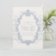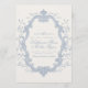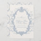 This is a dusty blue Save the Date featuring a rococo style floral frame and classic serif fonts. Most wording can be edited to fit your plans, including names, date, and location. The design has a calm, romantic feel and works well with a variety of wedding styles.