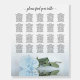 This gorgeous wedding seating chart has places for 200 guests at 20 tables - 10 seats per table. The design is simple yet elegant with a lacy script calligraphy title and a single long stemmed dusty blue or pale powder blue colored rose reflecting in a pool of water with waves and ripples. There is space for the names of the couple and the wedding date. Beautiful way to help your guests find their seats at your wedding reception.