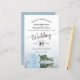 This beautiful wedding invitation features a romantic design with a single long stemmed pale dusty blue rose laying on its side and reflecting in a pool of water. The typography features lacy script calligraphy and a sophisticated layout. The back is a marbled light purple color. Wonderful way to invite your friends and family to share in your joy on your special day.